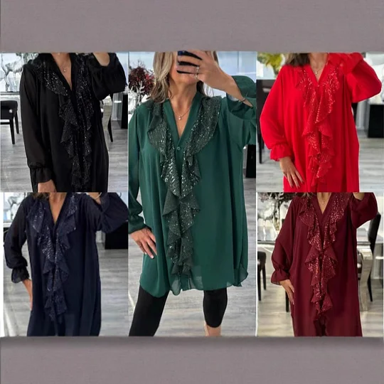 🎁Hot Sale 55% OFF✨Women's V-Neck Chiffon Sequin Long Sleeve Shirt